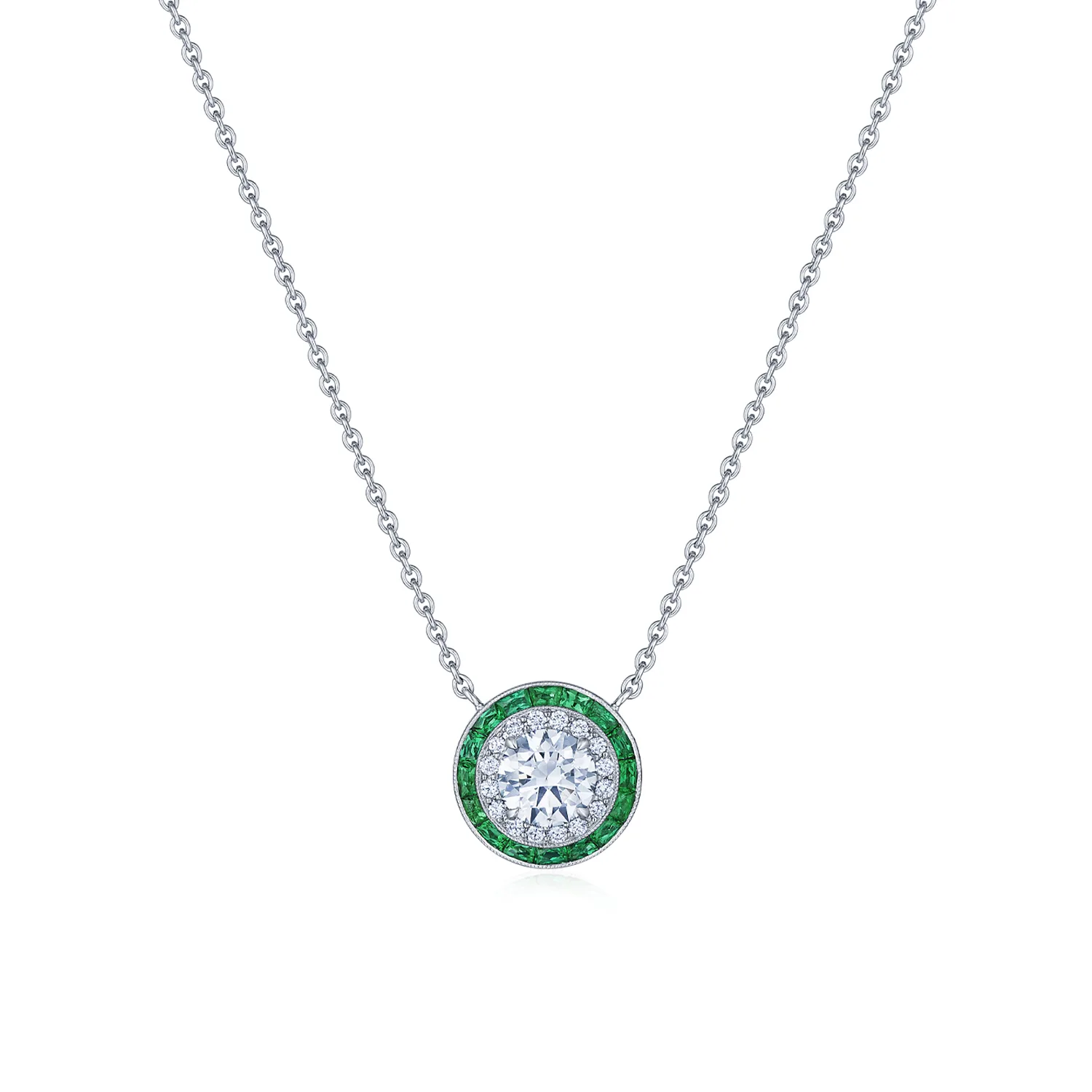 Silhouette Round Diamond and Emerald Halo Pendant